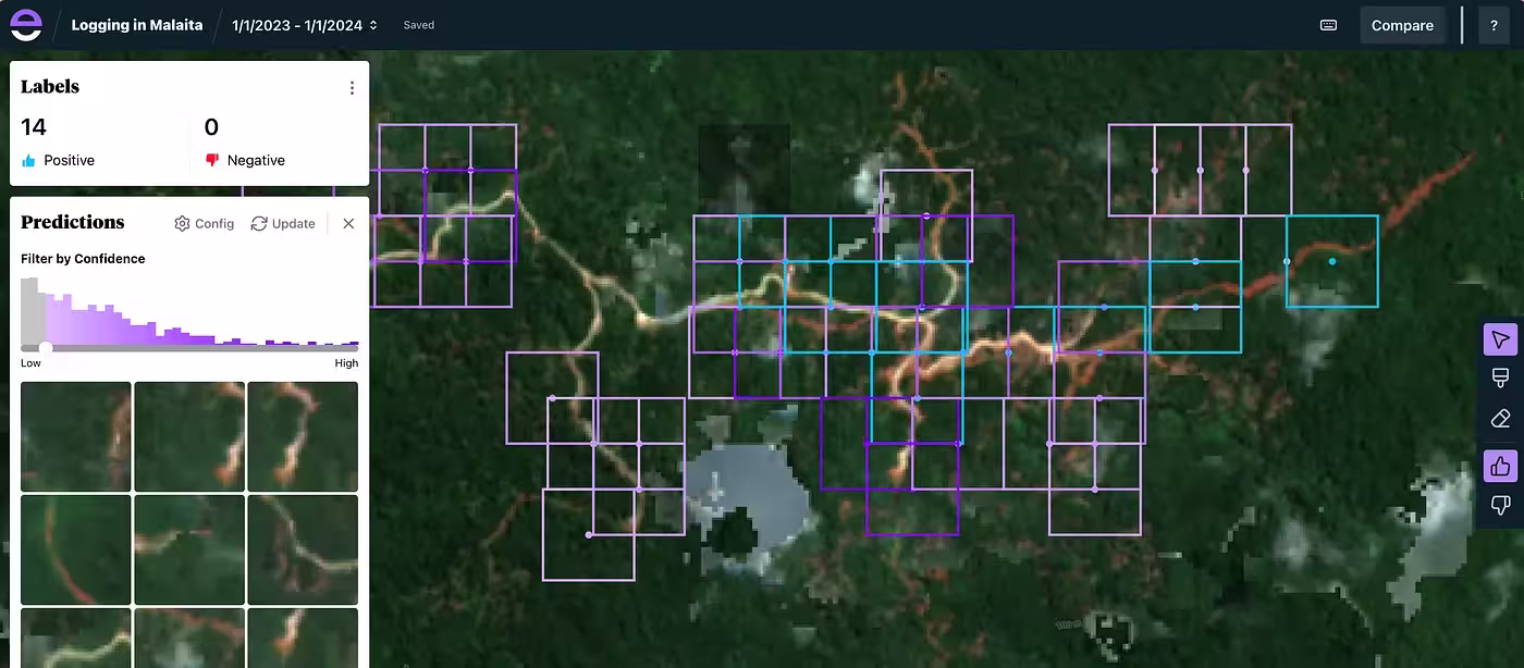 - New Compare Functionality: We’ve introduced initial functionality to help users compare two different searches side-by-side within a project. This feature makes it easier to track changes over time in satellite imagery and detect environmental shifts across different regions.