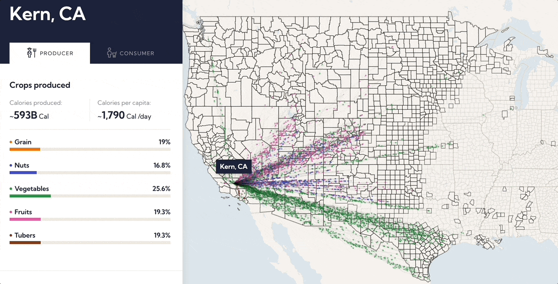 The application visualizes a custom built model designed to predict the connection between where food is grown and where it is consumed. Each colored point moving on the map correlates to an amount of calories from that food group. The consumer view on the map display how the food consumed in a county travels to that region; in the producer view it shows where food that grows in that county is consumed and how it gets to that area.