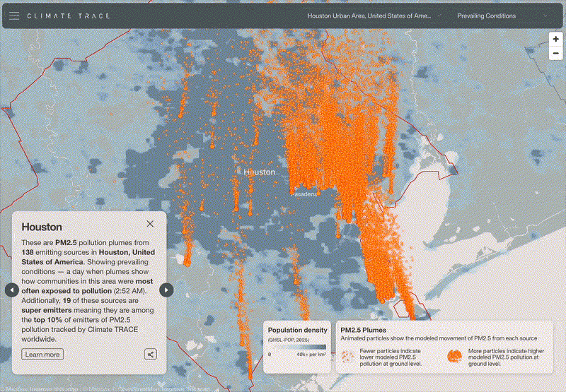 This year at Climate TRACE, we set out to visualize something that cannot normally be seen: how emissions move through the air, and how communities downwind are affected. Working with the CREATE Lab at Carnegie Mellon University, we built an animated plume layer that brings emissions to life in a way that is both intuitive and emotionally resonant.