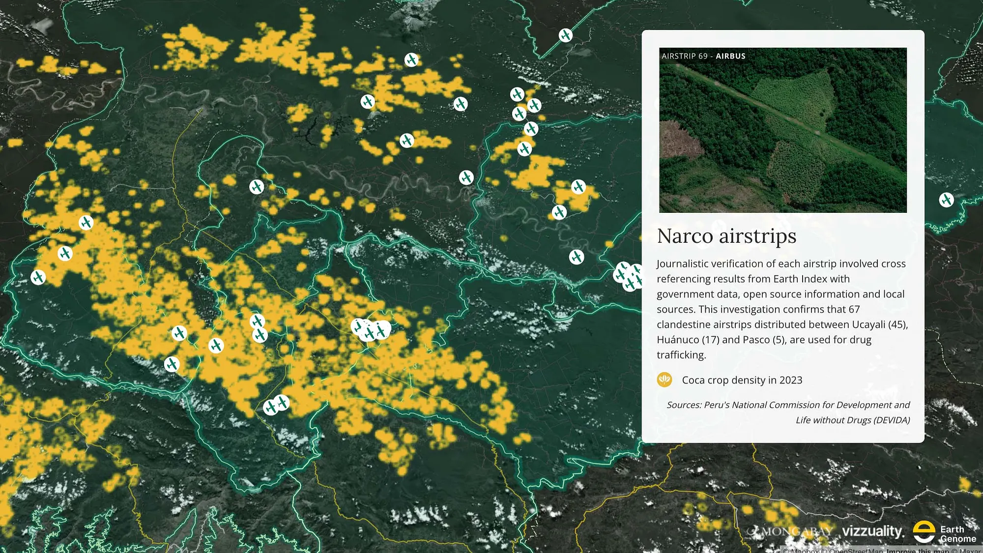 In the end, we found 67 unauthorized airfields across Ucayali, Huánuco and Pasco states that Mongabay confirmed are in use in the illicit drug trade.